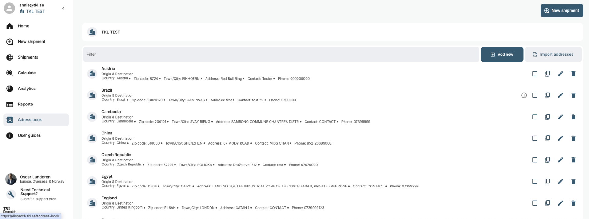 nu har vi introducerat en ny modul i Dispatch, en adressbok där du kan hantera dina upplagda adresser. Du hittar adressboken i vänstermenyn under “Rapporter”. I adressboken kan du lägga till, redigera, kopiera och radera adresser. Du kan också massimportera adresser in till systemet från en Excel-fil, samt göra inställningar som kundnummer för mottagarfrakt.