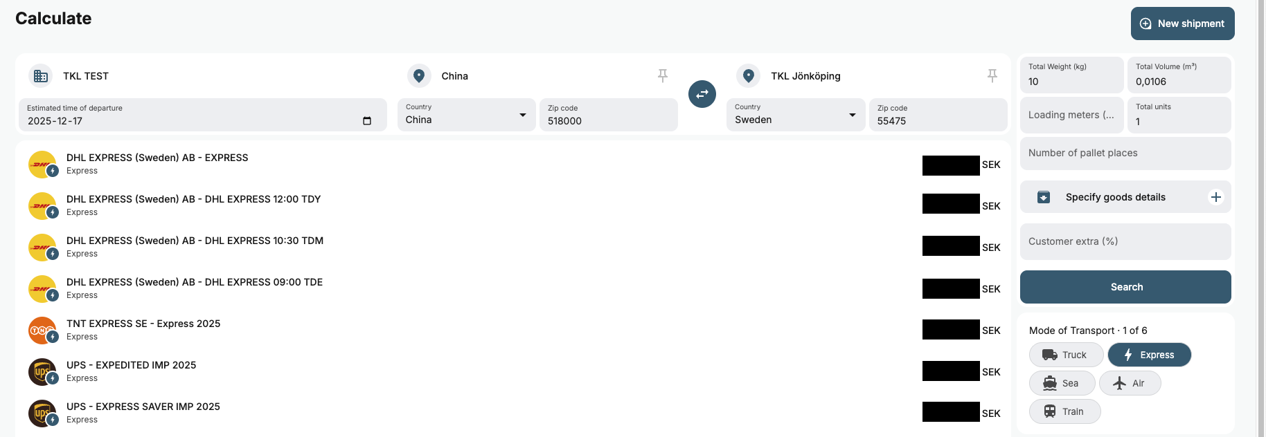 I denna modulen kan du enkelt själv ta fram priset på dina transporter. Du slår in information om avsändare, mottagare och uppgifter om godset och får direkt svar på vad det kommer kosta. På så sätt slipper du kontakta oss och invänta återkoppling. Speciellt användbart är detta vid mindre försändelser såsom paket, brev eller mindre pallar som skickas med kurirbolagen.